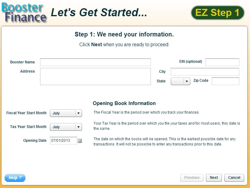 The Initial Setup process will allow you to establish the opening date and reporting period(s) for your accounting books and provide the current balances for your chart of accounts. To begin, follow the on screen instructions. Note: If at any time you need more information, please see the blue "Help?" button at the bottom left of each screen.