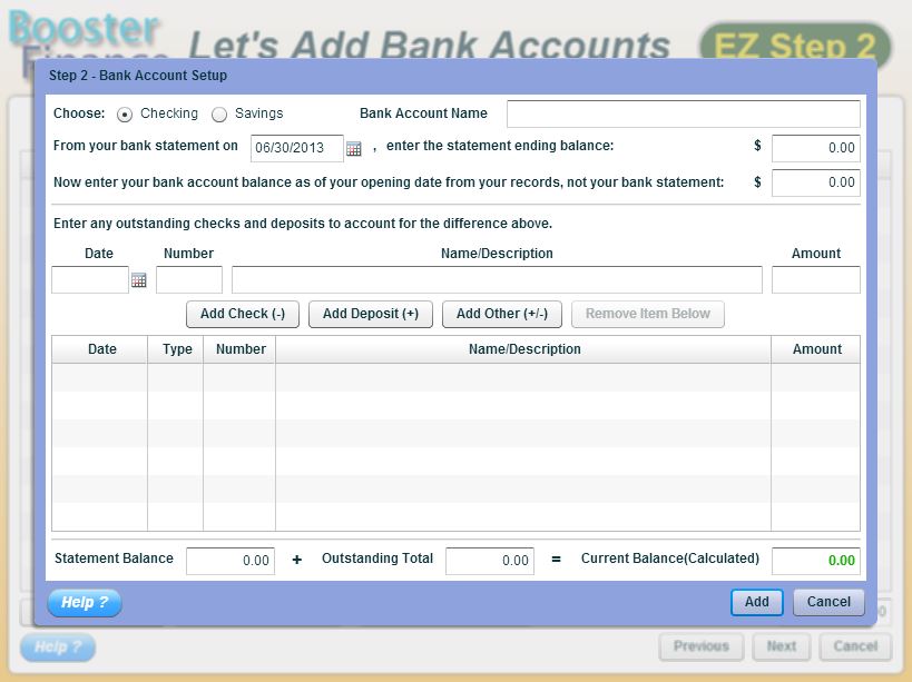 4.Add any outstanding checks and deposits by filling out the Date/Number/Name/Description portion and selecting either "Add Check" or "Add Deposit" Note: You can still complete setup without a balanced total – at your discretion (a red Current Balance figure) by using the “Add Other (+/-)” button. When using “Add Other (+/-)” you will need to specify a negative amount with a (-) in front of the entered number.
