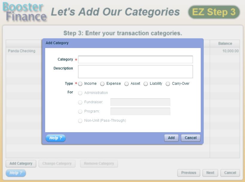 2.For Income and Expense categories, you’ll state whether these are tied to a Fundraiser or Program, or otherwise. Note: This association will remain with each category for transactions recording. Each recorded transaction will populate your activity reports.