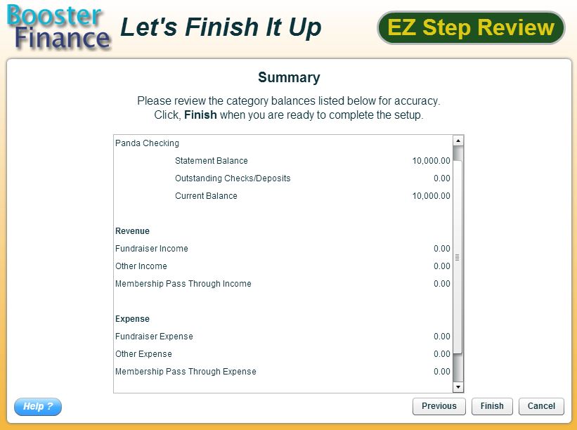Congratulations! You have finished the initial setup process. Before selecting "Finish" please review all of your categories and fund balances to make sure they are accurate. Note: You may not restart this process after it is completed.