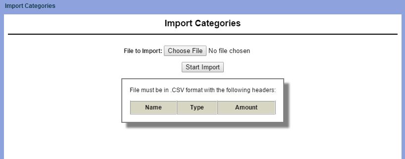 New: You can now import a .cvs file of your transactions categories by selecting the “Import” button on this screen. Column Headers must match those shown below: