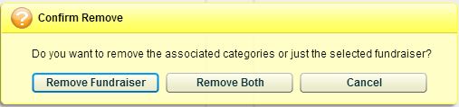 To Remove a Fundraiser/Program select the Red Circle with the minus (-) sign in it: This will ask you if you would like to remove Just the Fundraiser/Program, Remove Both (the Fundraiser/Program and the Categories that have been created for you on the next screen) or Cancel:
