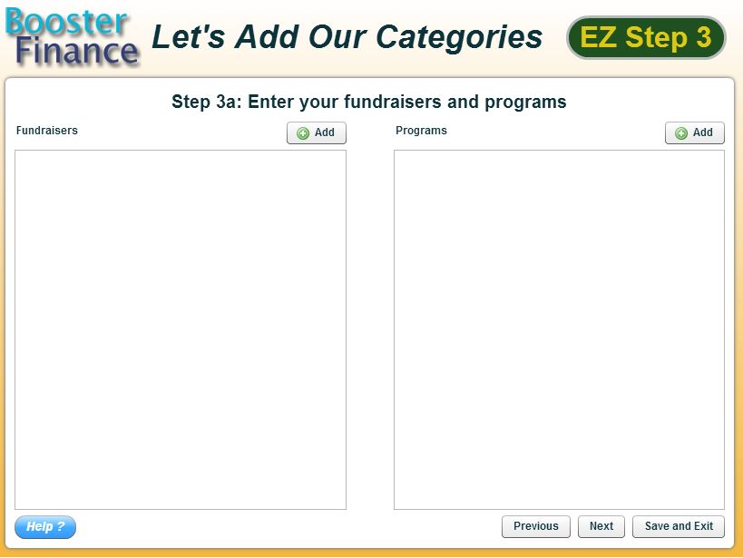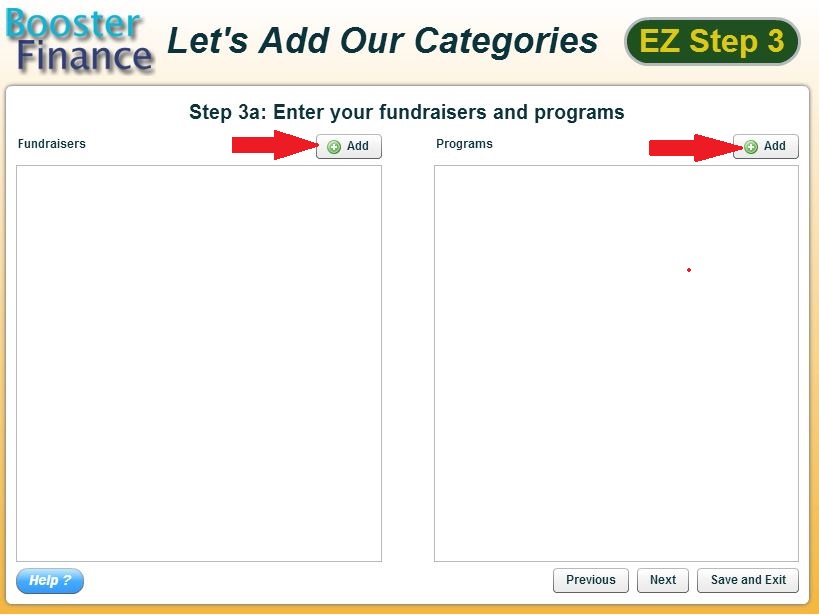 Now it is time to setup your Fundraisers and Programs. Setting up your Fundraisers and Program will create ONE income and ONE Expense Account for each Fundraiser or Program you add (in Setup Step 3b on the next page).