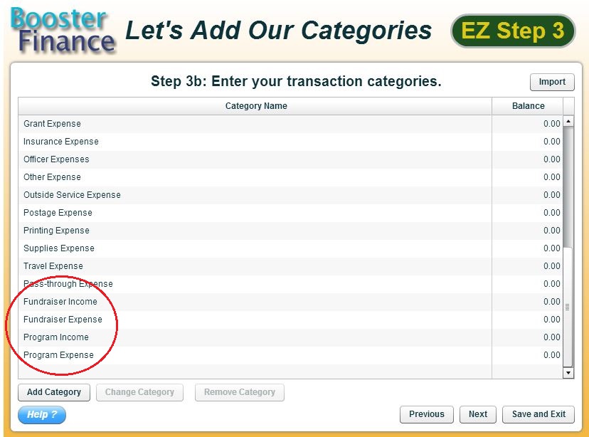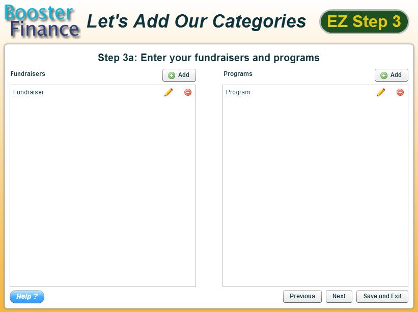 Booster Finance pre-loads certain categories for you as well as created ONE income and ONE expense category for each of the Fundraiser/Programs you entered in the previous step. You have the ability to Remove any of these categories that you do not need, or edit them: